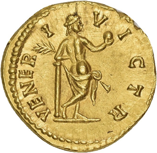 Julia Domna, Augusta 193-217 AD. AV Aureus (20 mm; 7.19 g). Rome mint, struck under Septimius Severus, circa 193-196 AD. Obverse: IVLIA DOMNA AVG, Draped bust of Julia Domna right. Reverse: VENERI VICTR, Venus standing with back turned, facing right, drapery falling below hips, resting left elbow on column; holding palm frond in left hand and apple with raised right hand. Almost as struck and highly lustrous.