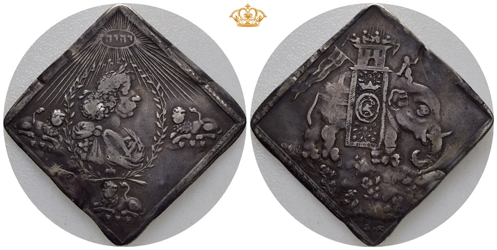 Klippe medal (1670), struck for the commemoration of Christian V's coronation and the award of the Order of the Elephant to Johann Adolf of Schleswig-Holstein-Sonderburg-Plön, signed Gotfred Krüger. Silver, 37x37mm, 12,6 g. Dents, minor edge nicks.