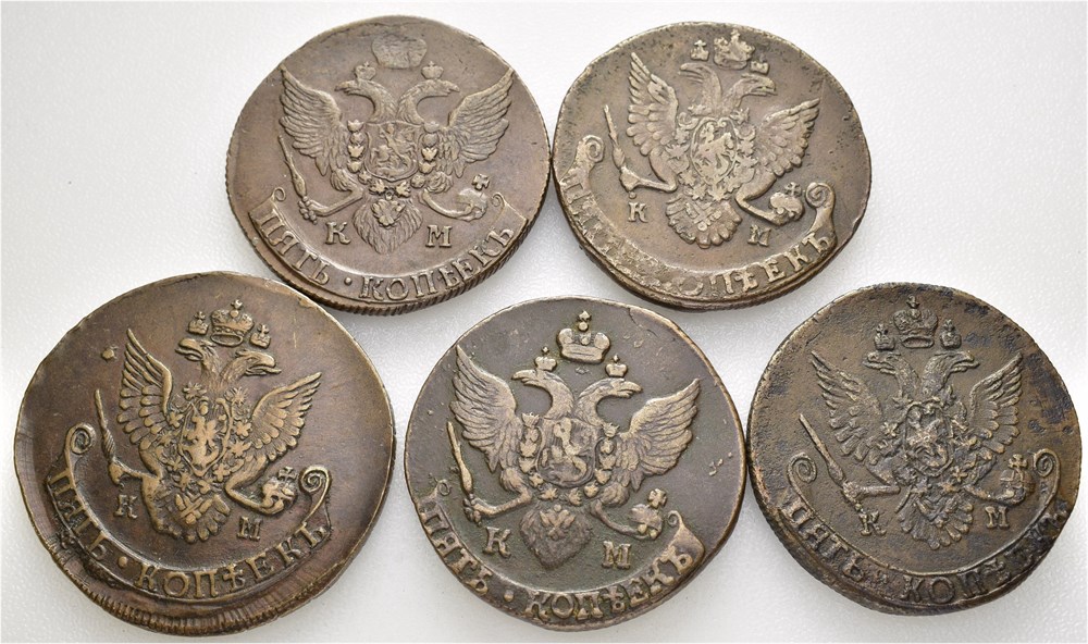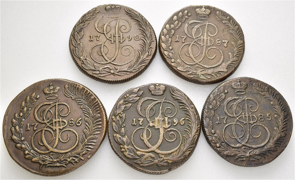 Lot. 5 kopek 1785, 1786, 1787, 1790 & 1796 KM