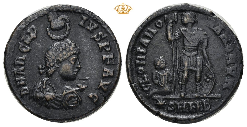 Arcadius 383-408 AD. Æ Follis 393-396 AD, Nicomedia mint, 5,44 g. Obverse: D N ARCADIVS P F AVG, bust of Arcadius, draped and cuirassed, holding spear and shield, facing right, hand holding wreath above. Reverse: GLORIA ROMANORVM - SMNB, Arcadius standing, head facing left, with labarum and shield, captive left.