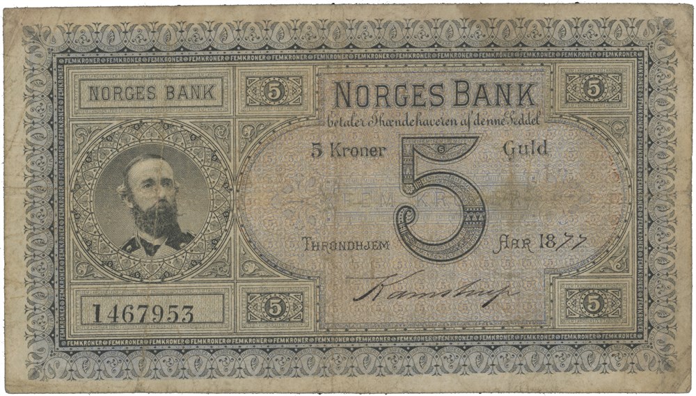 5 kroner 1877. 1467953. Signert Kamstrup.