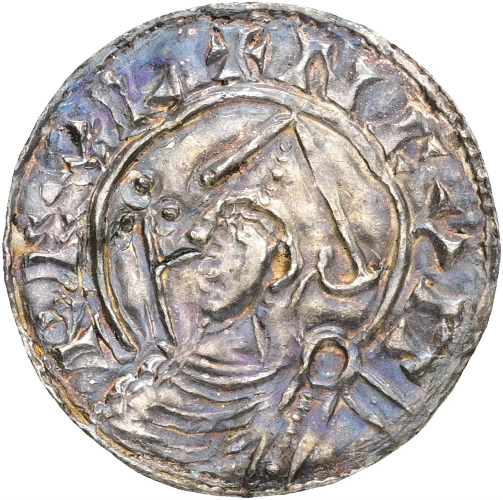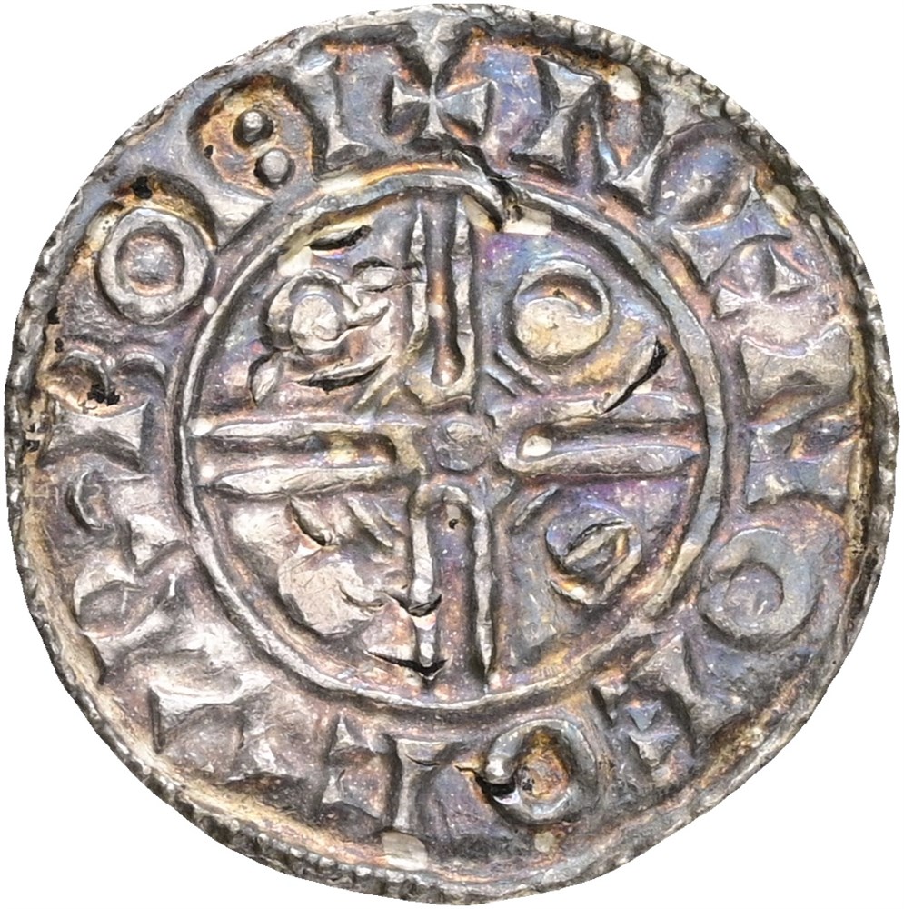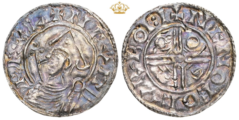 Penning, Sydskandinavia. 1,11 g. Imitation av Knud den Stores engelske Pointed Helmet type, slått etter 1023. Fint eksemplar med fullt lesbare innskrifter (+NCVIT REXL / +NCNOEOCVRBOI:I).