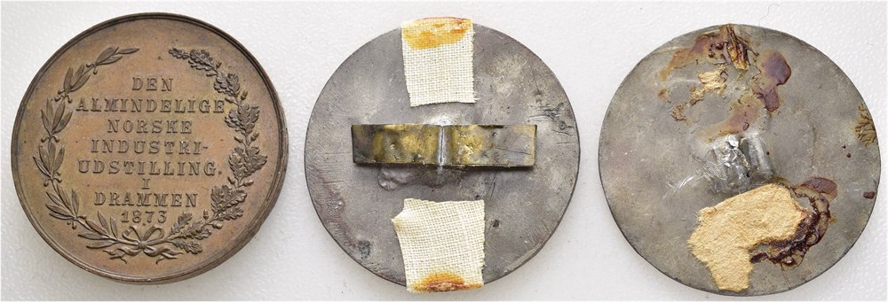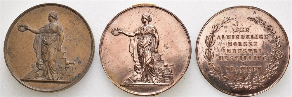 Industriutstilling i Drammen 1873. Prismedalje. Tildelt Lysaker Chemiske Fabrik. Bergslien/Conradsen. Bronse. 42 mm; 29,61 g. Fingermerker. To ensidige avslag i bronse