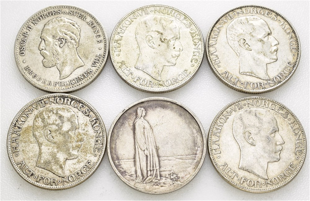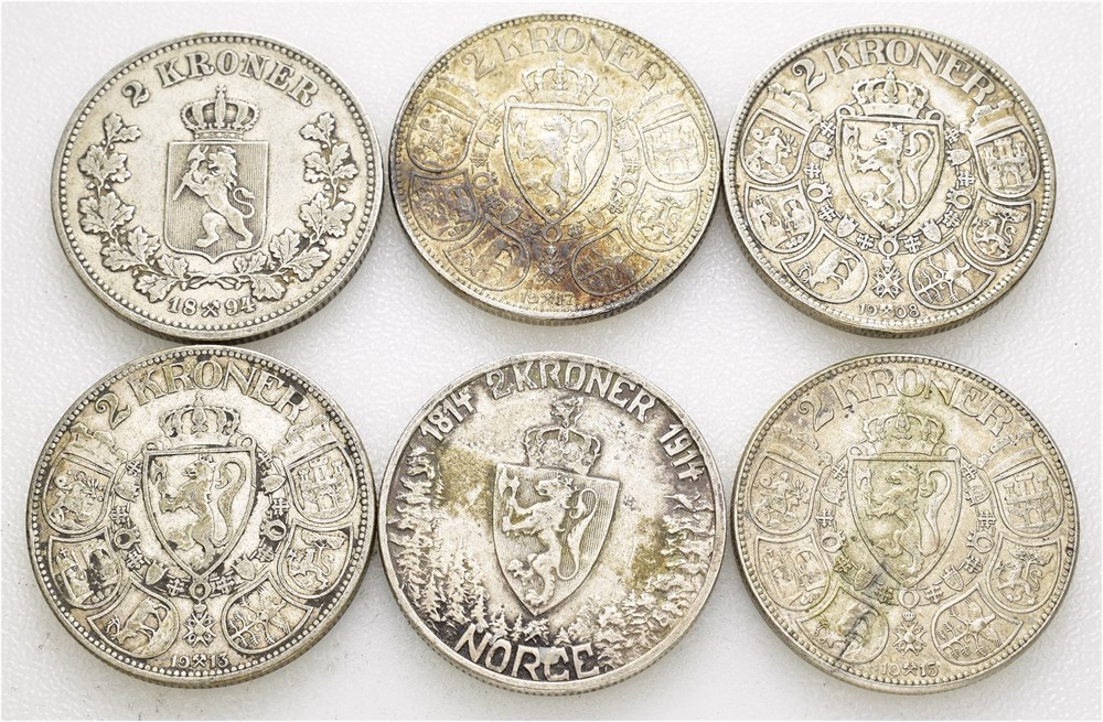2 kroner 1894, 1907 "Unionsoppløsningen", 1908, 1913, 1914 "Mor Norge", 1915 & 1917. Varierende kvalitet.