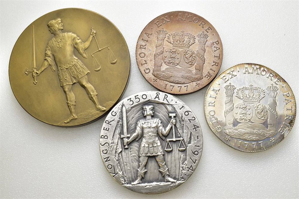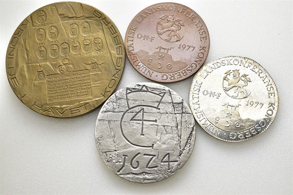 Numismatisk landskonferanse Kongsberg 1977 (Sølv og bronse 40 mm), Kongsberg 350 år (Sølv 45 mm) og Kronene i Håvet (Bronse 56 mm)