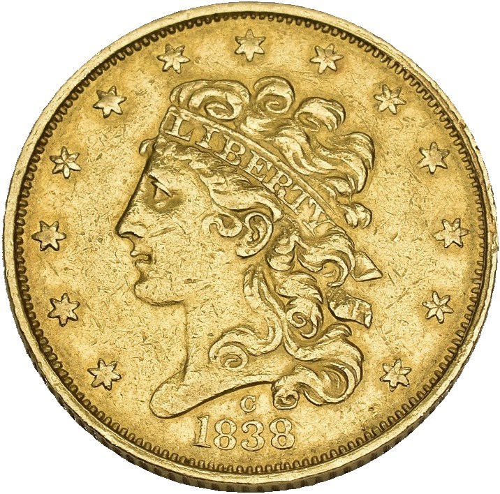 5 Dollars 1838 C, Charlotte. 8.35 g. Planchet flaw.