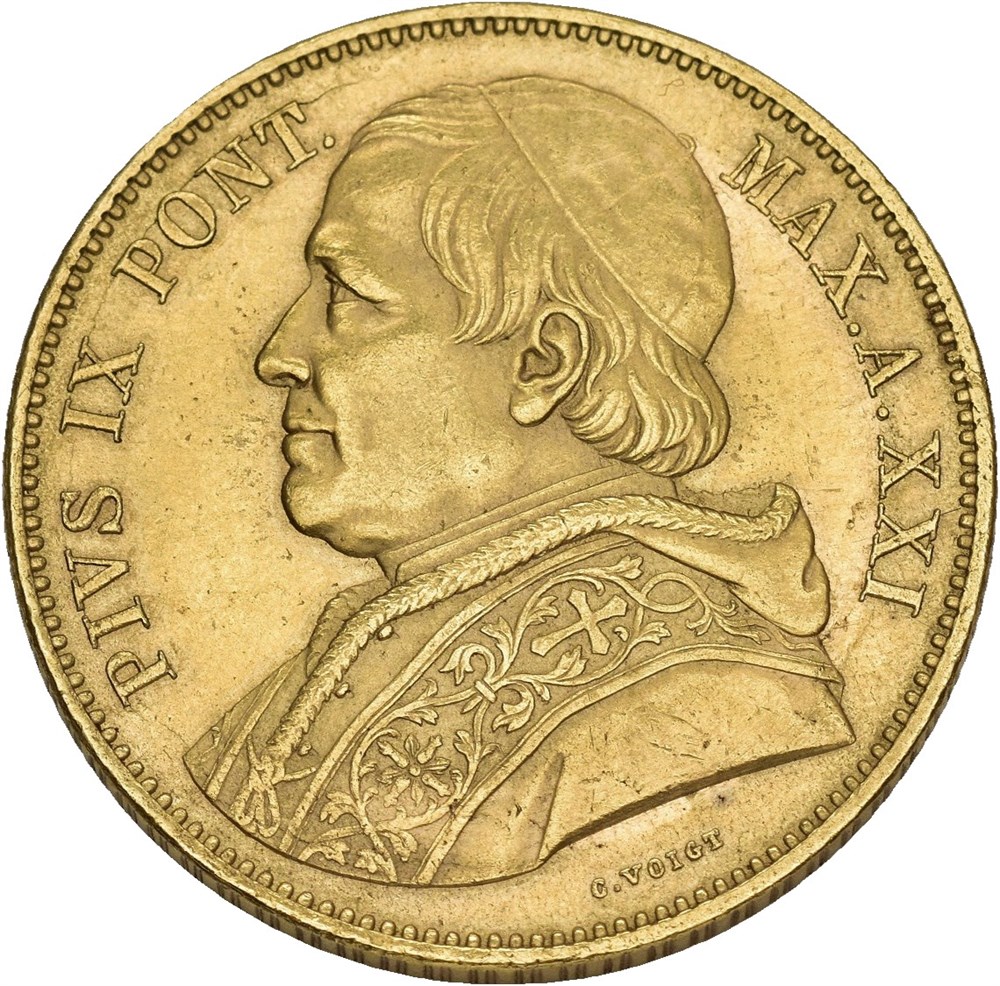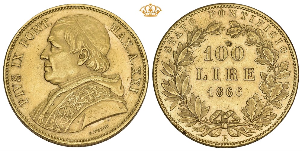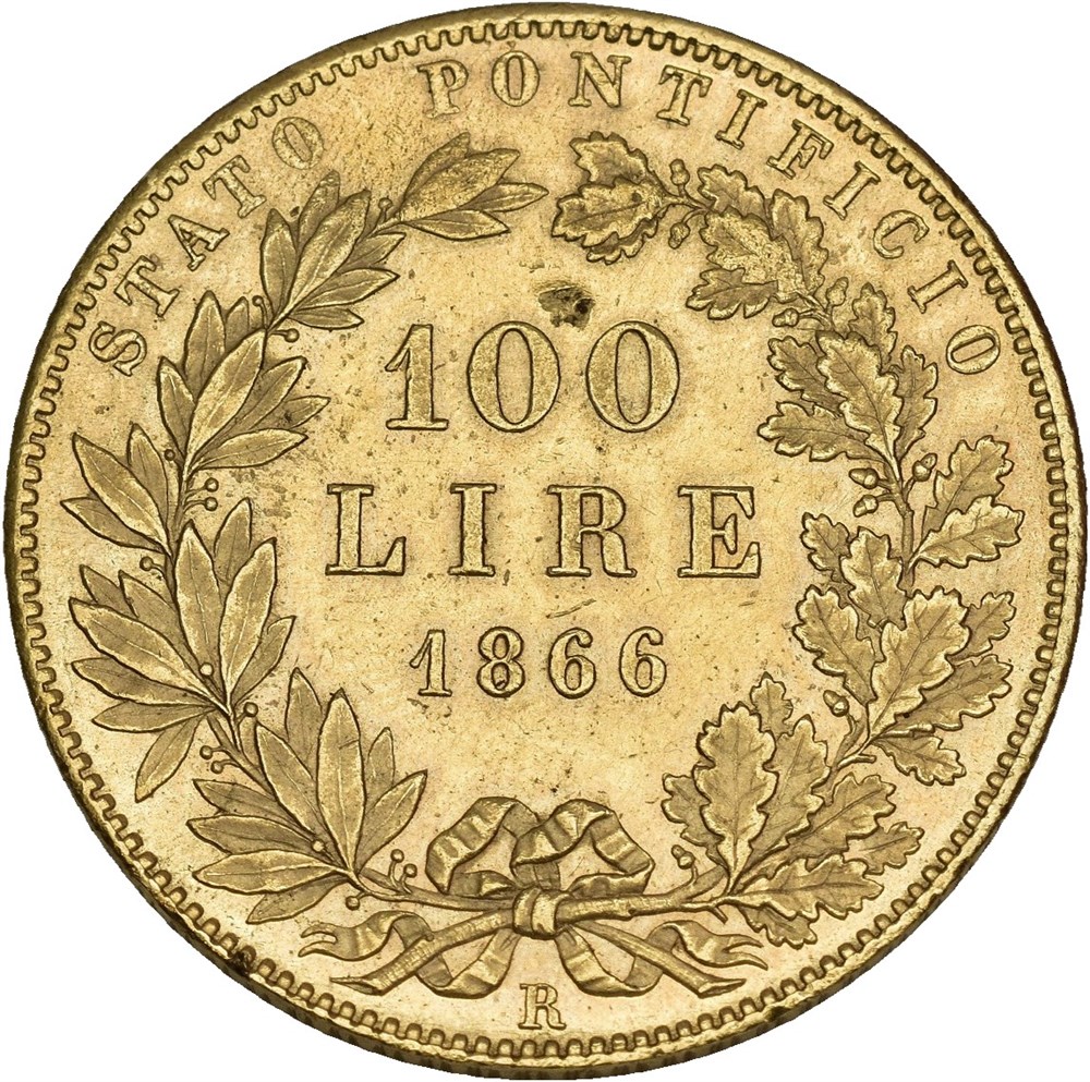 100 Lire 1866, Rome. 32.32 g. Scuff mark on reverse.