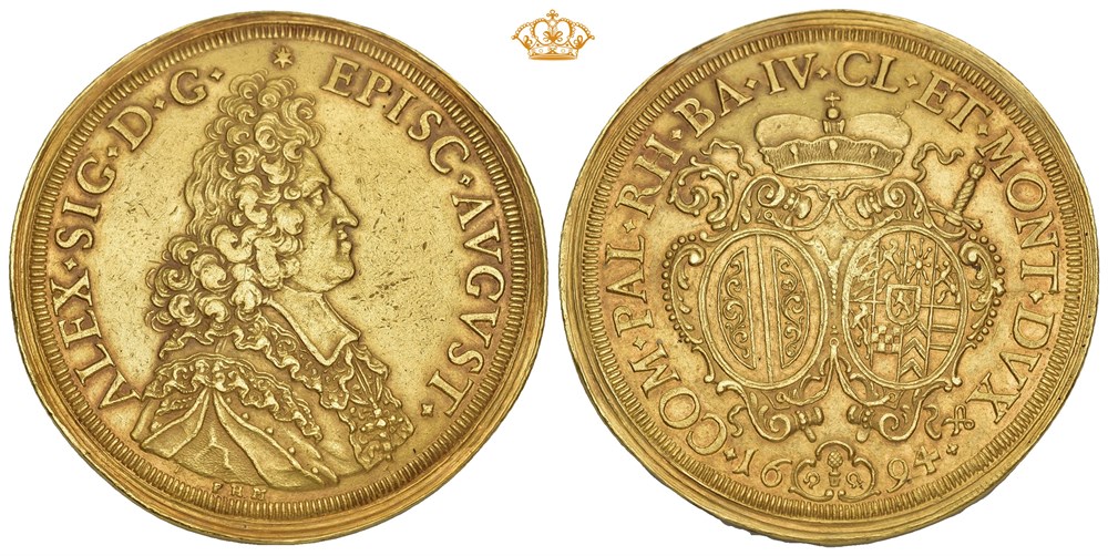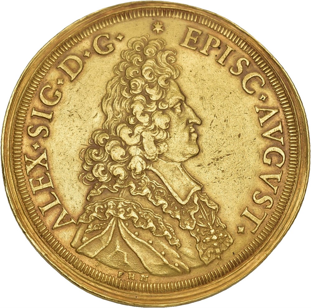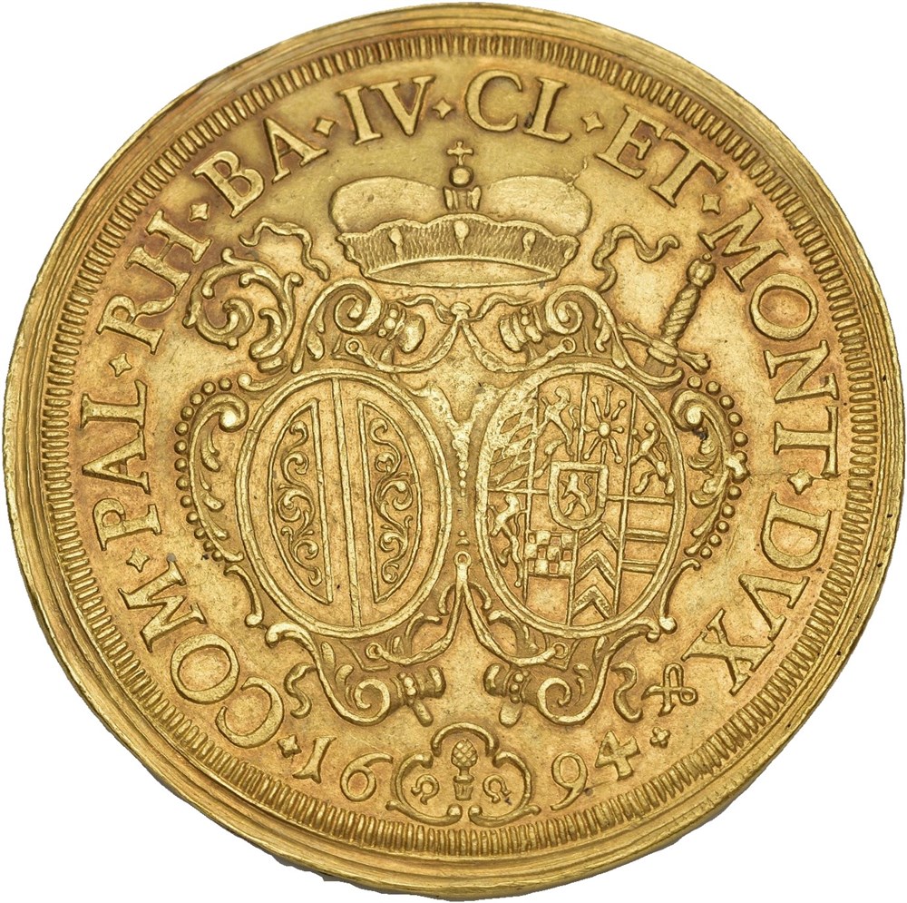 10 Ducats 1694, Augsburg. 34.33 g. Graffiti, repaired. Unique.