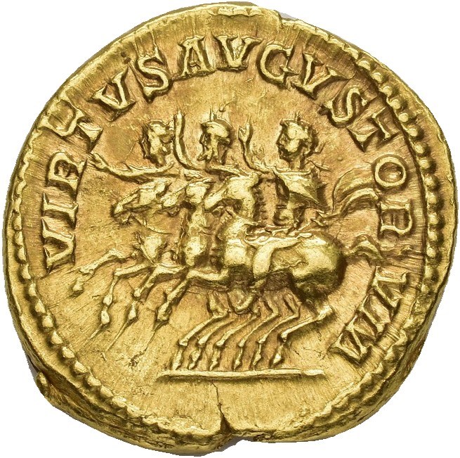 Septimius Severus 193-211 AD. AV Aureus (20 mm; 6.96 g). Rome mint, struck 210 AD. Obverse: SEVERVS PIVS AVG BRIT, Laureate bust right. Reverse: VIRTVS AVGVSTORVM, Septimius Severus, Caracalla, and Geta on horseback prancing left, each with their right hand raised. Minor edge split at 6 o'clock. Well struck and with a considerable amount of luster in fields. Very rare.