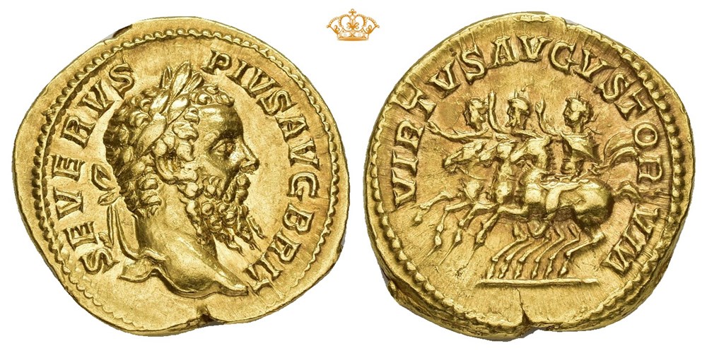 Septimius Severus 193-211 AD. AV Aureus (20 mm; 6.96 g). Rome mint, struck 210 AD. Obverse: SEVERVS PIVS AVG BRIT, Laureate bust right. Reverse: VIRTVS AVGVSTORVM, Septimius Severus, Caracalla, and Geta on horseback prancing left, each with their right hand raised. Minor edge split at 6 o'clock. Well struck and with a considerable amount of luster in fields. Very rare.