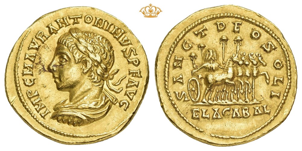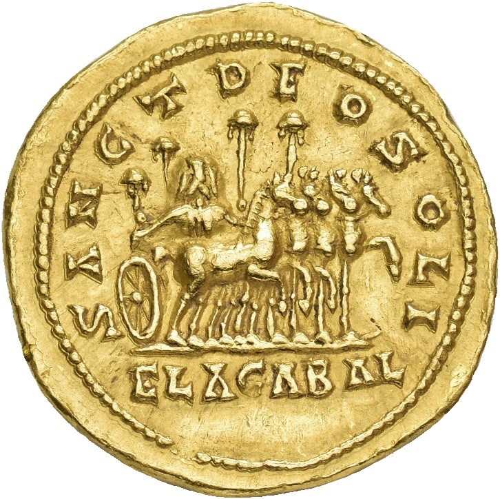 Elagabalus 218-222 AD. AV Aureus (22.5 mm; 7.18 g). Antioch mint, struck 218-219 AD. Obverse: IMP C M AVR ANTONINVS P F AVG, Laureate, draped and cuirassed bust left. Reverse: SANC DEO SOLI / ELAGABAL, Quadriga advancing right, containing the sacred stone of Emesa upon which an eagle is standing; four parasols around. A few marks and scuffs along edge. An artistic portrait of Elagabalus struck in high relief. Extremely rare.