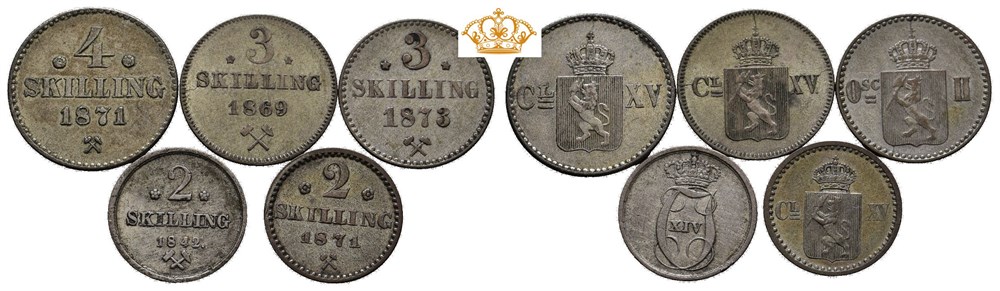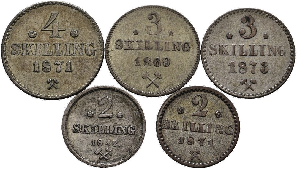 Skillingslott 2 sk 1842, 71, 3 sk 1869, 73 og 4 sk 1871 i varierende kvalitet, fra 1 til 1+