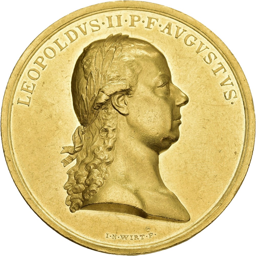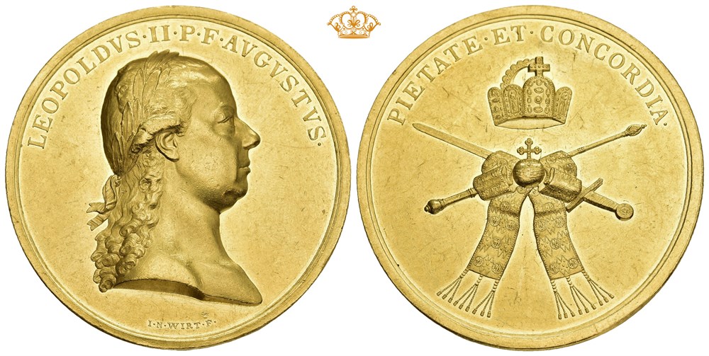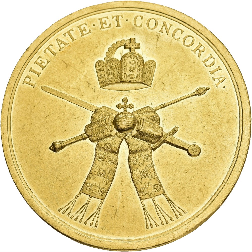 Coronation of Leopold II as emperor in Frankfurt ND (1790), Johann Nepomuk Wirt. Gold medal in 20 ducat size. 49mm, 69,94 g. Obverse: LEOPOLDVS•II•P•F•AVGVSTVS, bust of Leopold II, signed by engraver below. Reverse: PIETATE•ET•CONCORDIA, imperial insignia on a sash, imperial crown above. Extremely rare.
