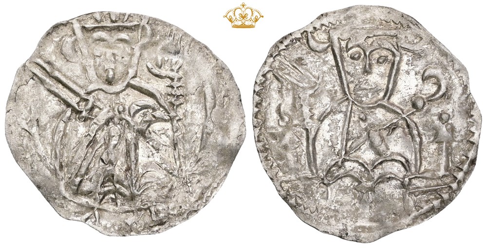 Denne interessante typen ble preget mellom 1143 og 1146, mens Eskild var erkebiskop. Vi ser her det senere typiske motivet for Valdemartidens mynter med konge på forsiden og biskop på baksiden.