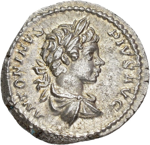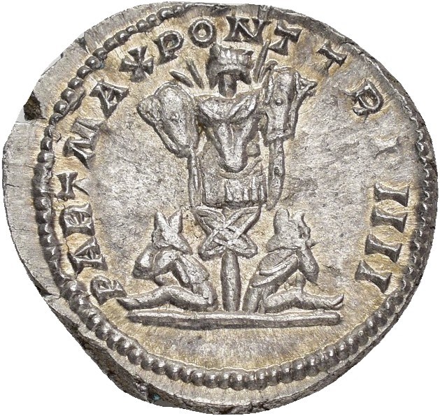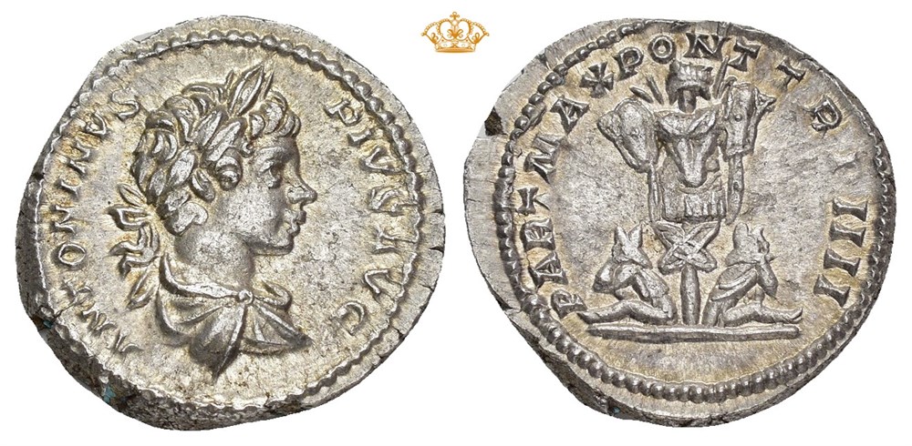 Caracalla 198-217 AD. AR Denarius (19 mm; 3.64 g). Rome mint, struck 201 AD. Obverse: ANTONINVS PIVS AVG, Laureate, draped and draped bust of Caracalla right. Reverse: PART MAX PONT TR P IIII, Two mourning captives seated back-to-back on either side of a central trophy. Well struck and lightly toned.