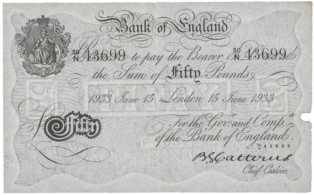 50 pounds London 15.6.1933. No. 50/N 43699. Operation Bernhard counterfeit, signed Catterns. Paper maker's notch.