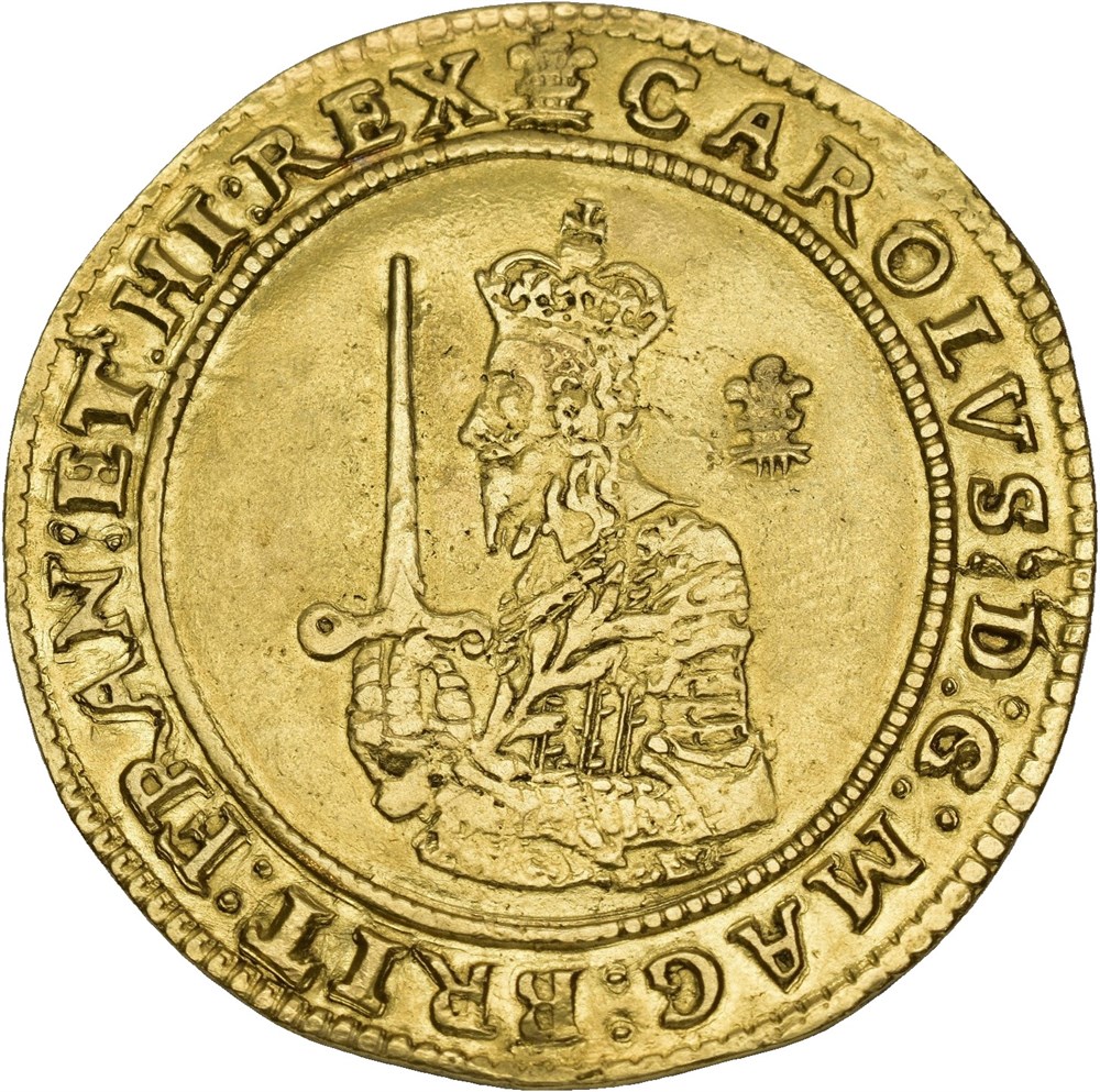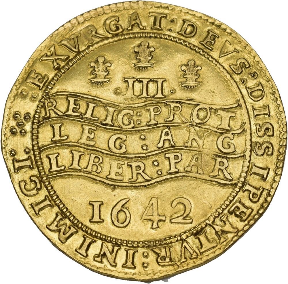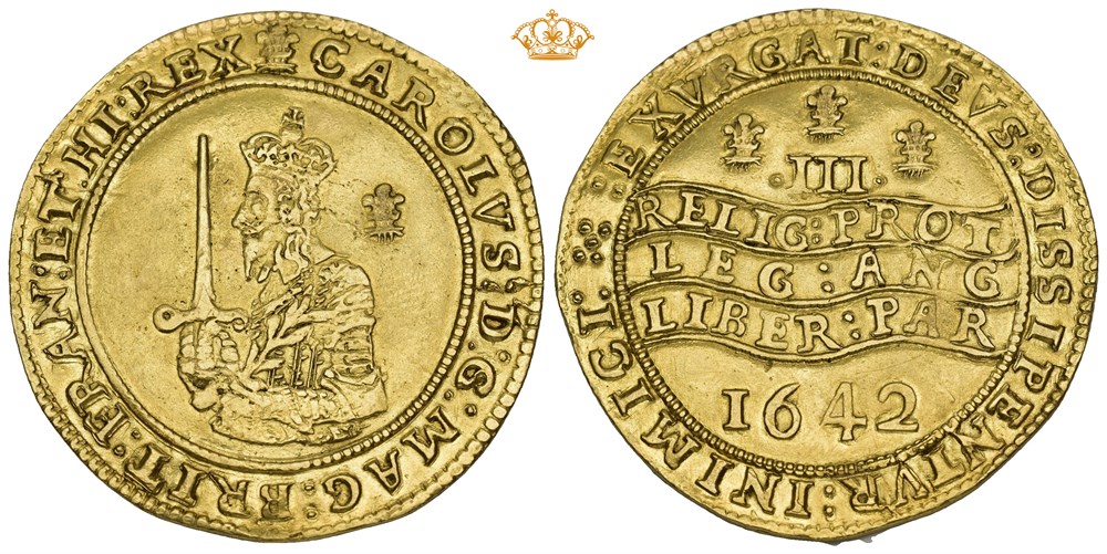 Triple Unite 1642, Oxford. 27.05 g. Lightly smoothed. Incredibly rare piece, featuring the half-length bust of a king whose realm was facing the tremendous turmoil of a civil war. This specimen exhibits a good deal of luster along with a very pleasing strike.