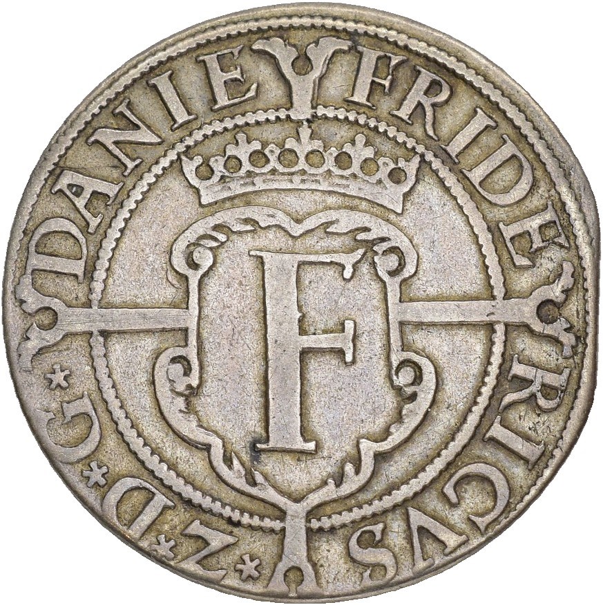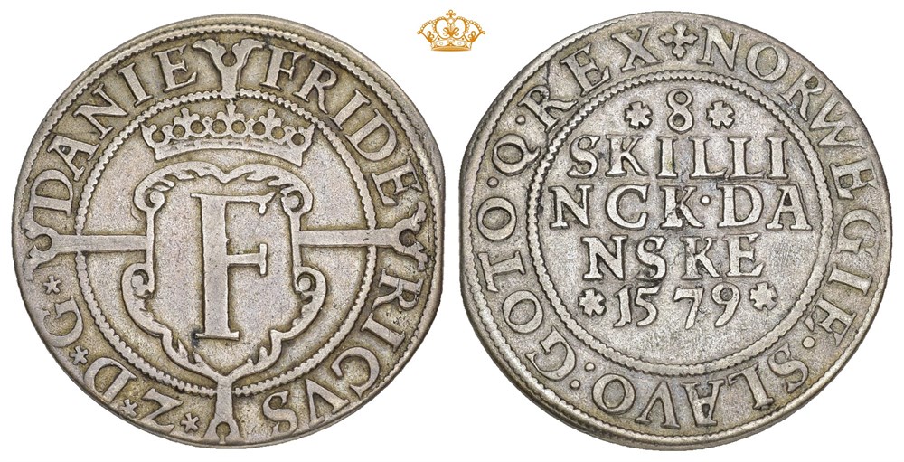 8 skilling 1579, København. 5,24 g. Fint eksemplar av Hans Dellhusens særdeles sjeldne typen med kongens navnebokstav.