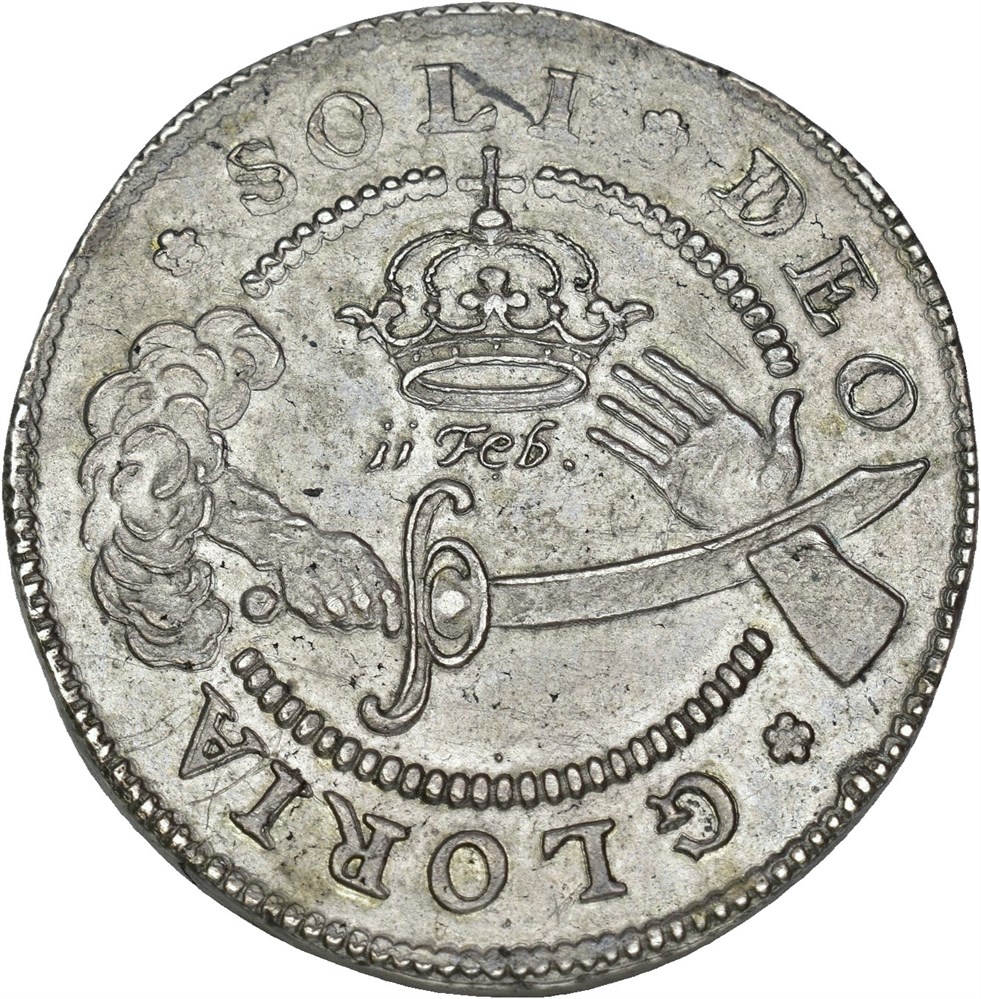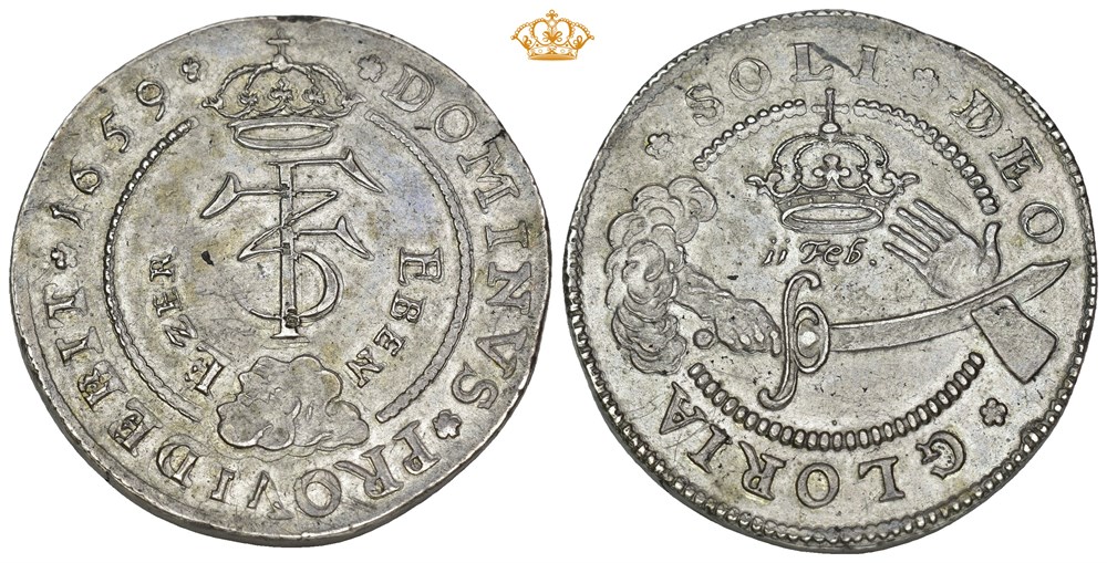 Interessant dobbeltkrone preget til minne om Karl X Gustavs mislykkede forsøk på å erobre København. Det dramatiske motivet viser Guds hånd som, med rettferdighetens sverd, hugger av den svenske kongens hånd idet han forsøker å gripe den danske kronen.