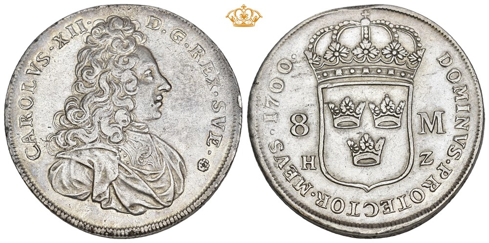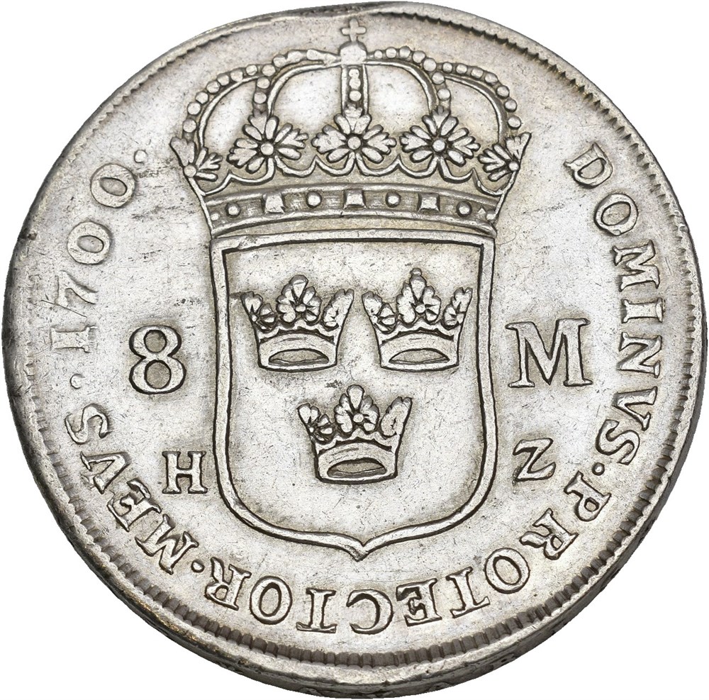 8 mark 1700, Stockholm. 31,99 g. Tidligere anhengt.