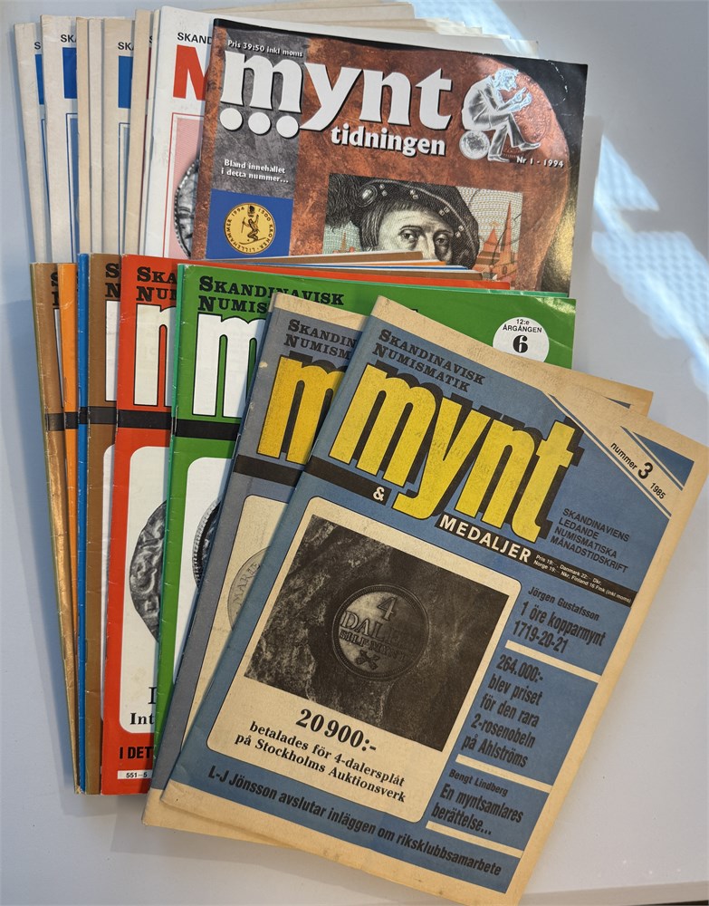 Skandinavisk Numismatikk Mynt & Medaljer nr 10/1981, 1-2 1982, 3, 4, 5, 6, 6/1983, 1/1985, 2, 3. Skandinaviska Myntmagasinet 2.a årgangen, nr 1/1986, 6/1986, 1/1987, 2, 3, 4, 5, 6, 7, 1/1988, 2/1988, 1/1989, 2/1989. Mynttidningen nr 1/1994.