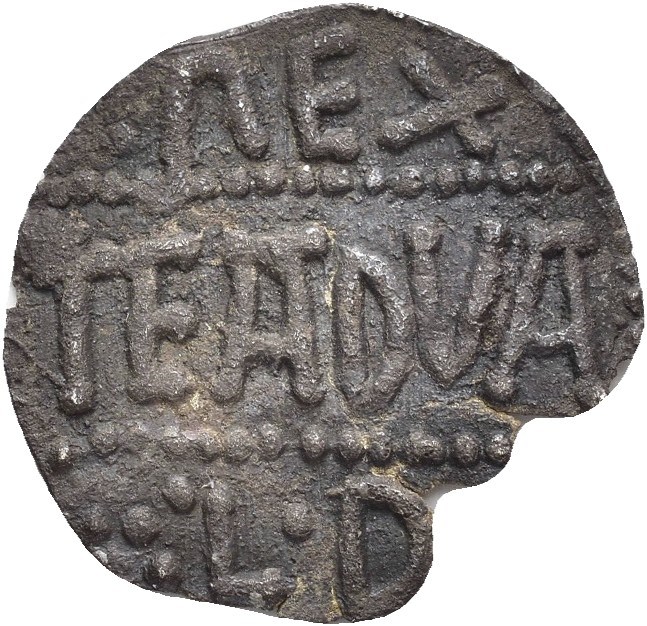 Penny, mint in East Anglia (Ipswich?). 1.19 g. Wihtræd, moneyer. +EADWALD REX / ИI/HT/RE/·∂. Large edge damage.