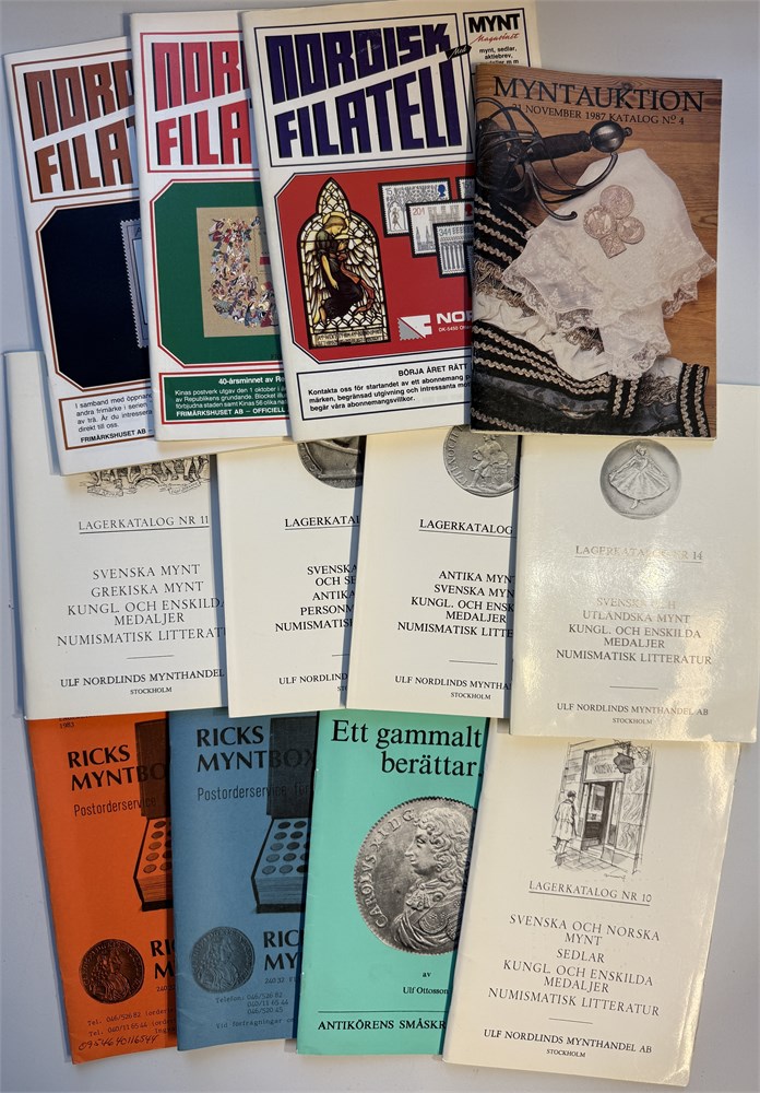 Ricks Mynt liste 3/1983, liste 4/1984. Antikørens småskriftserie nr 1. Ulf Nordins Mynthandel lagerkatalog nr 10, 11, 12, 13, 14.