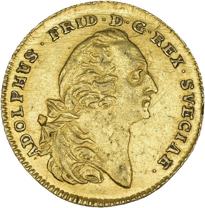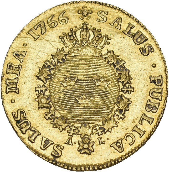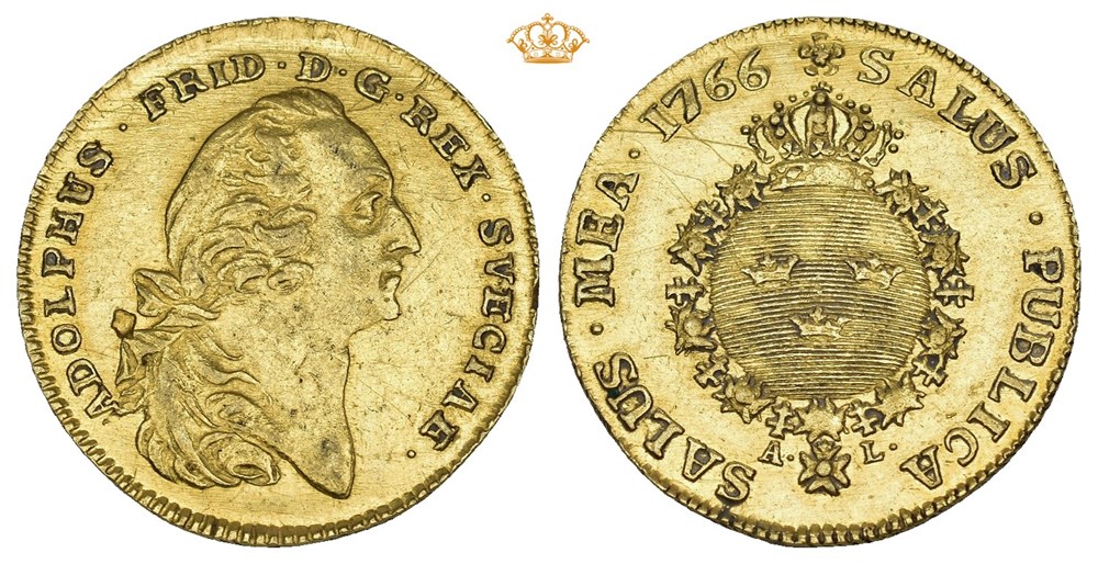Dukat 1766, Stockholm. 3,46 g. RR. Riper, kanthakk, liten blankettfeil.