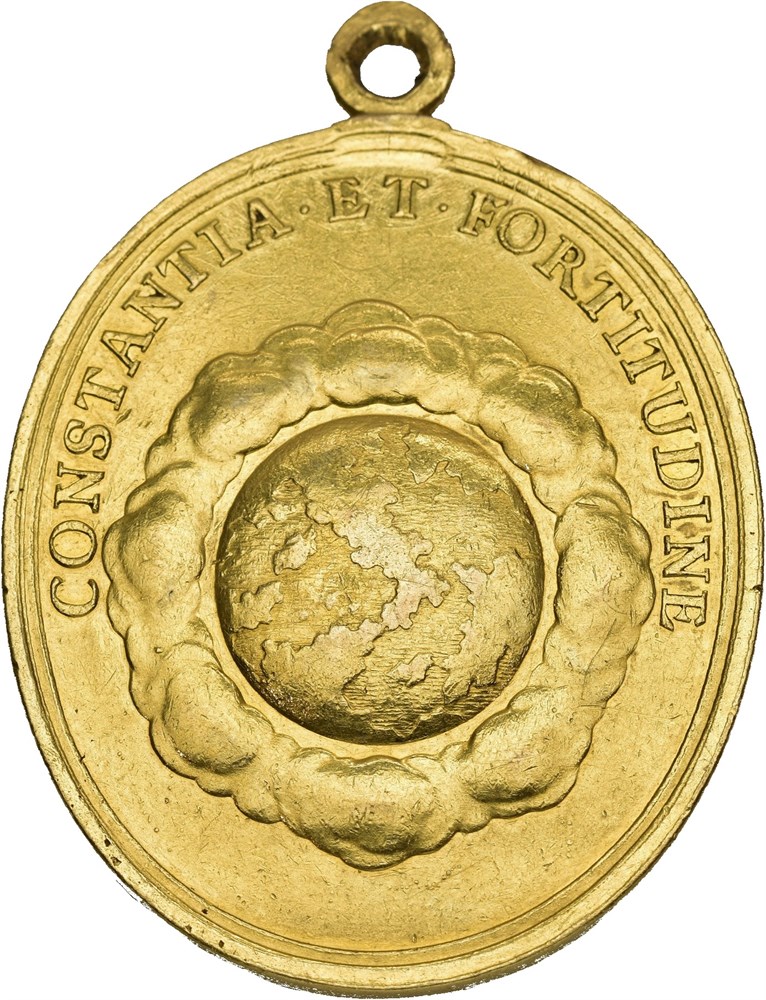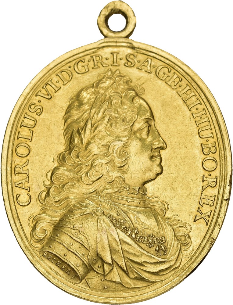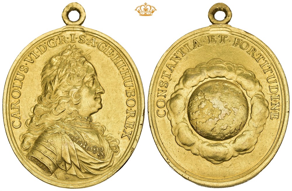 Coronation of Charles VI as Holy Roman Emperor at Frankfurt 1711. Oval gold medal ND (1711). Becker. 55x41 mm (incl. loop). 49.59 g (ca. 15 Ducat). CAROLUS VI D G R I S A GE HI HU BO REX / CONSTANTIA ET FORTITUDINE, Globe in wreath of cloudes. Edge nicks, small scratches. Lightly cleaned. Rare.