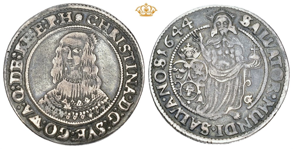 1/4 Riksdaler 1644, Stockholm. 7,08 g. RR. Variant med grovt vevd mantel. Svært sjelden.