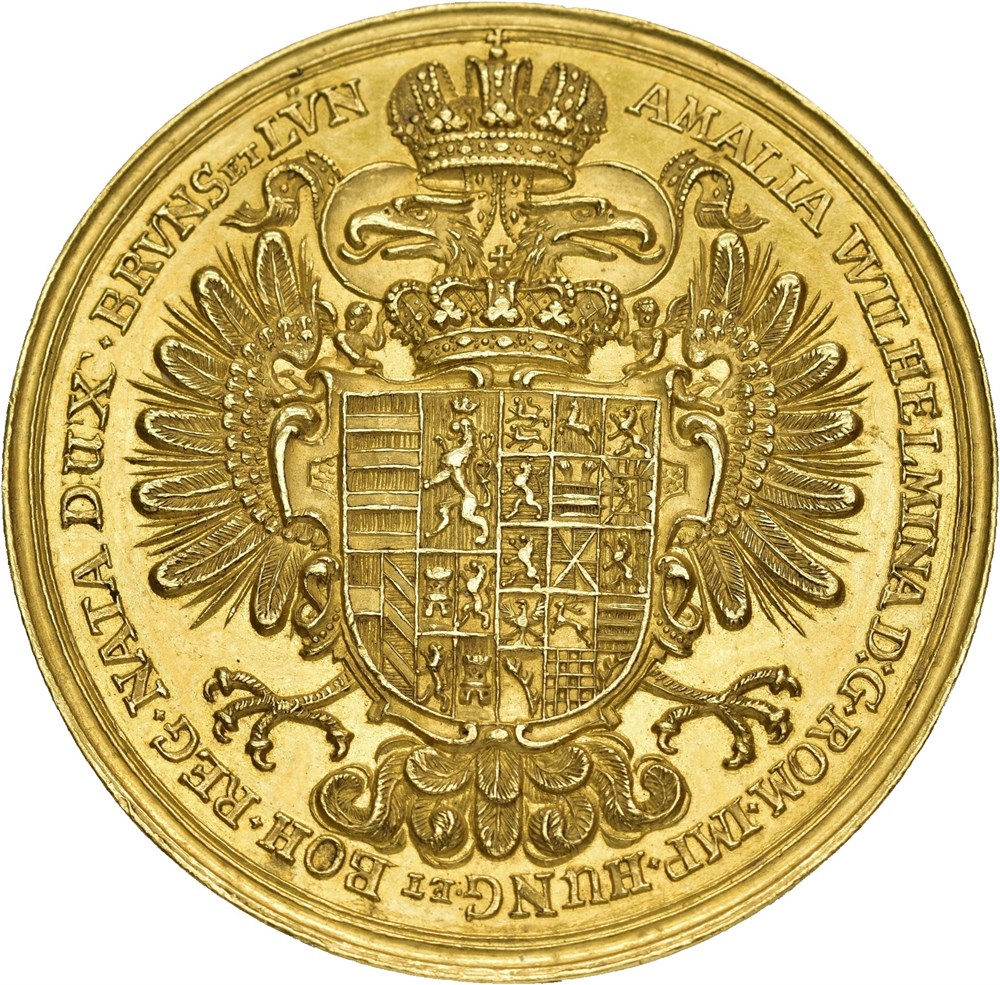 Wilhelmine Amalie ND (1705), cousin of Georg I Ludwig of Hannover, daughter of Johann Friedrich of Braunschweig-Lüneburg, wife of Joseph I, Holy Roman Emperor from 1705 to 1711. Gold medal, 24-25 Ducats. 52.48 mm; 83.81 g.