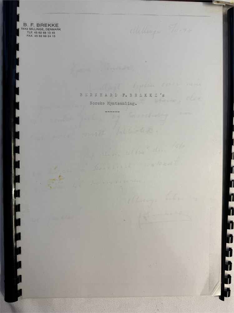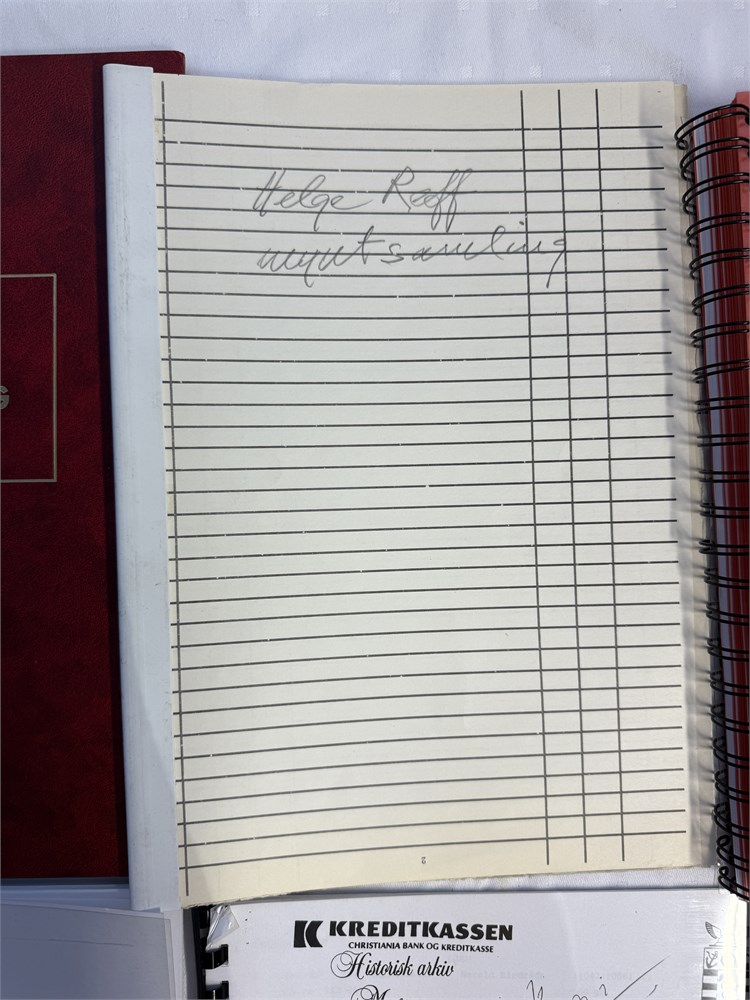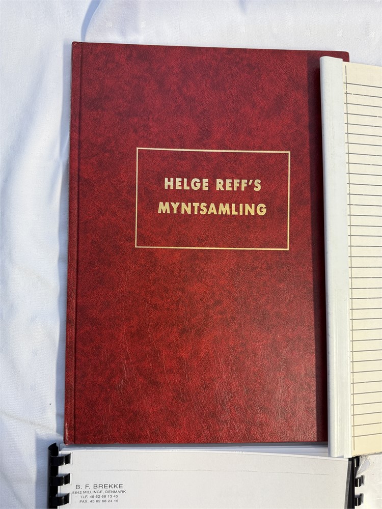 Helge Reff’s myntsamling 1991, hovedsamlingen i auksjon 28. innbundet i pent bind, samt kopi av Reffs egen fortegnelse over sin samling.