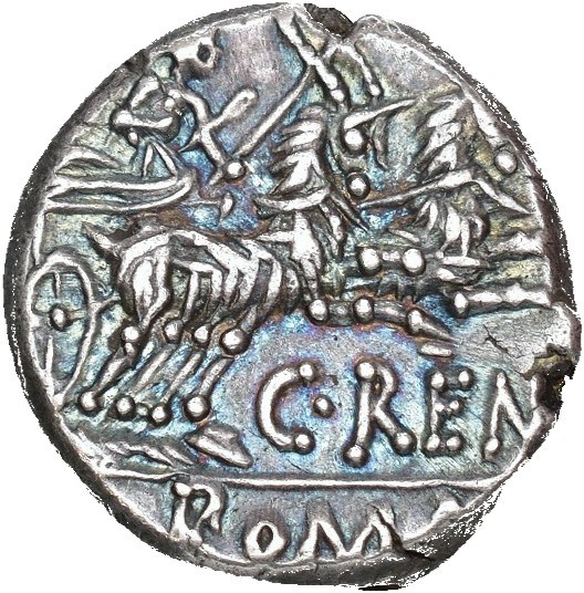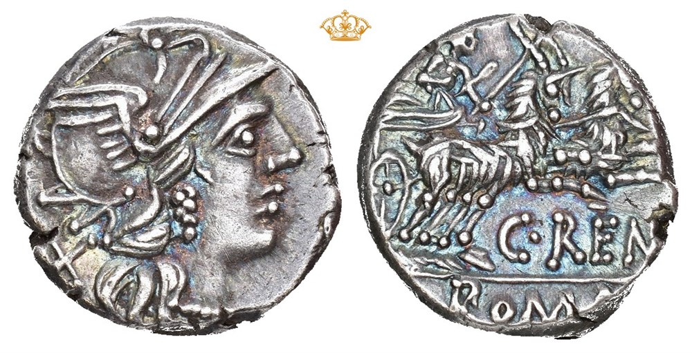 C. Renius, 138 BC. AR Denarius (16 mm; 3.86 g). Rome mint. Obverse: Helmeted head of Roma right, X (mark of value) behind neck. Reverse: C•RENI - ROMA, Juno Caprotina driving biga of goats right. Struck on a thick and tight flan. Beautiful blue iridescent toning.