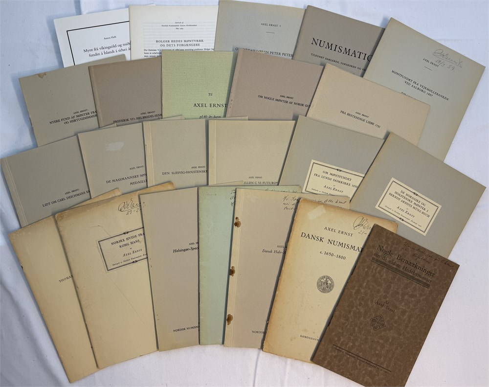 Axel Ernst 22 hefter fra 1924-1964 med en mengde numismatiske spesialartikler, heftet, samt et par særtrykk fra Island, og om Holger Hede