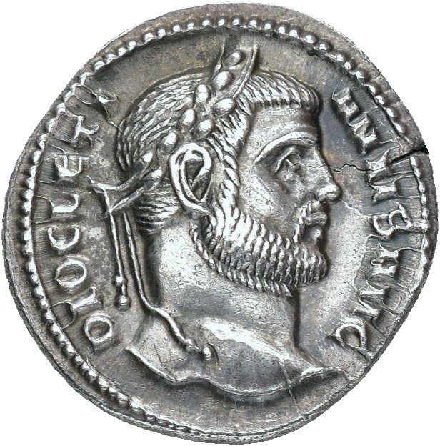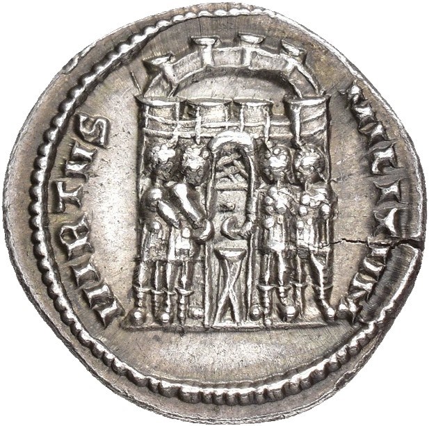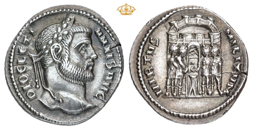 Diocletian 284-305 AD. AR Argenteus (19 mm; 3.40 g). Siscia mint, struck circa 294-295 AD. Obverse: DIOCLETIANVS AVG, Laureate head of Diocletian right. Reverse: VIRTVS MILITVM, The tetrarchs sacrificing over tripod before city gate with eight turrets. Thin flan crack. Almost as struck and with an attractive iridescent toning.