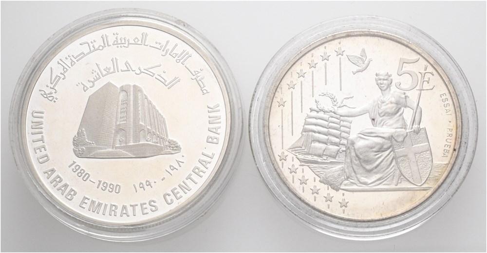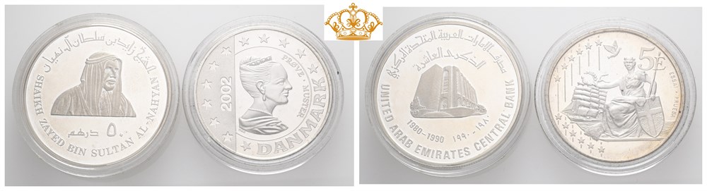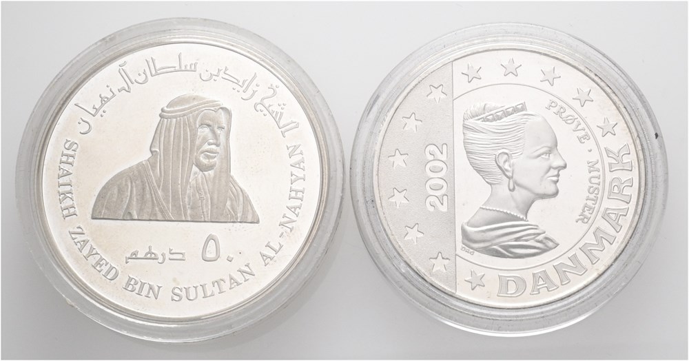 Lot 2 silver coins. United Arab Emirates; 50 dirham 1990 (1992), mintage 2000 pcs. Denmark; 5€ 2002 piedfort, pattern/fantasy coin, mintage 2500 pcs. Totally 74,5 grams 925/1000 silver.