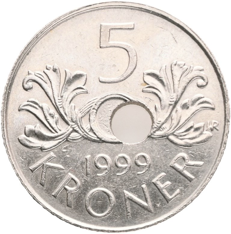 5 kroner 1999 skjevt sentrert hull