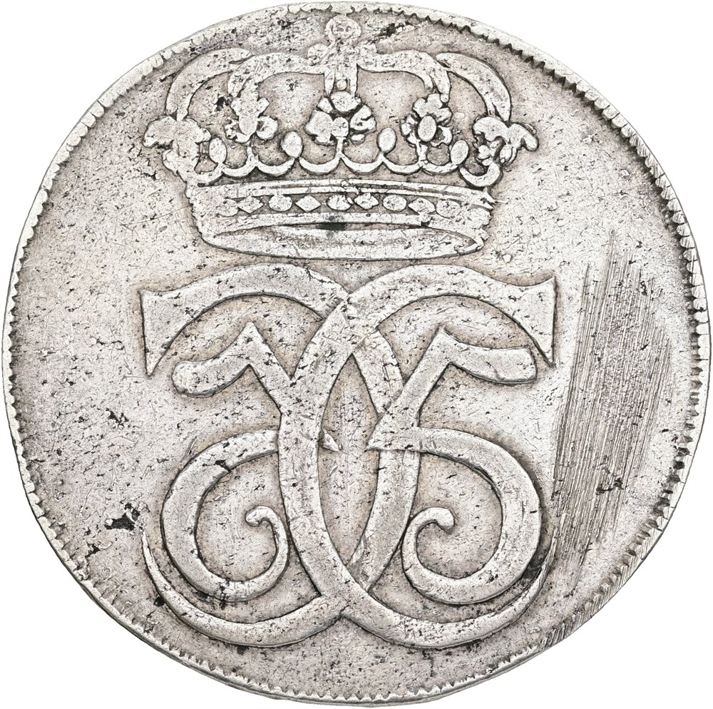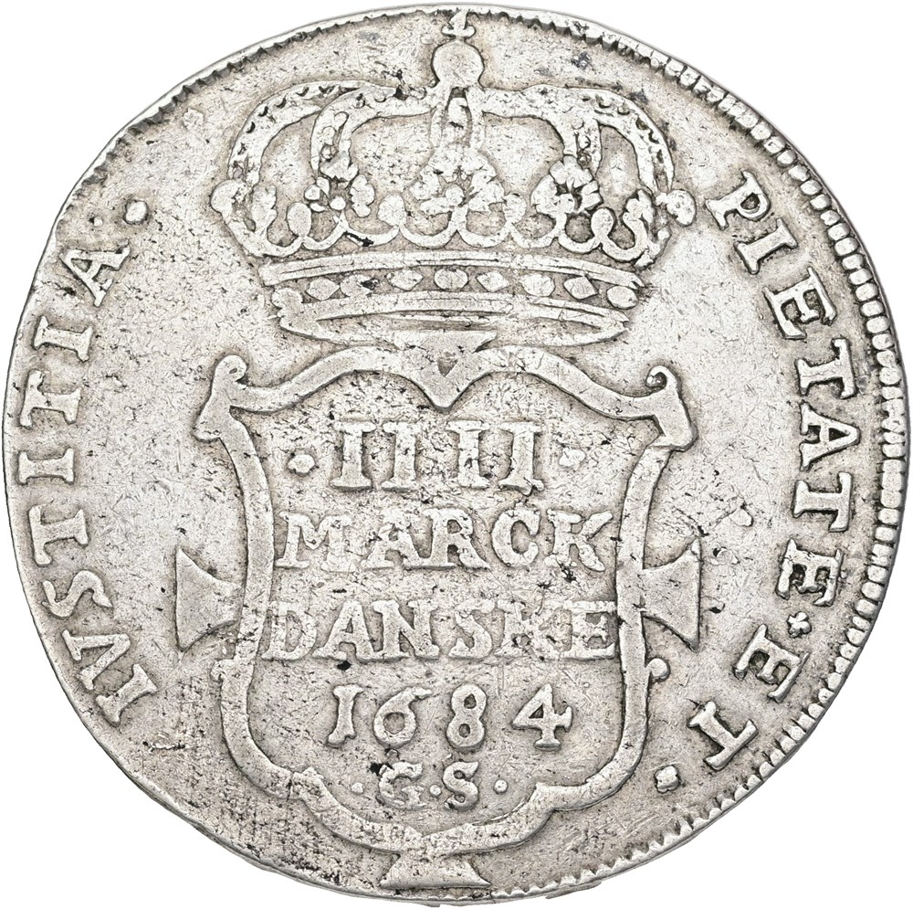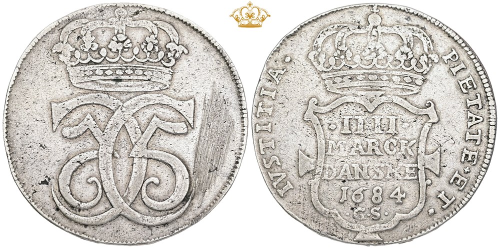 Krone 1684, København. 22,05 g. Mange riper i høyre adversfelt. Små kantskader. Ellers et fint eksemplar av denne sjeldne varianten med innsvingte skjold og bemerkelsesverdig stor diameter (40 mm).