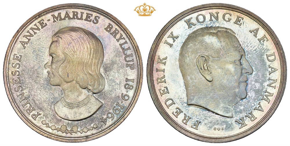 2 kroner 1964, uten verdiangivelse. Prinsesse Anne-maries bryllup med Kong Konstantin. København. Ministereksemplar, opplag på kun 100. Flott patina, litt berørt. I etui.