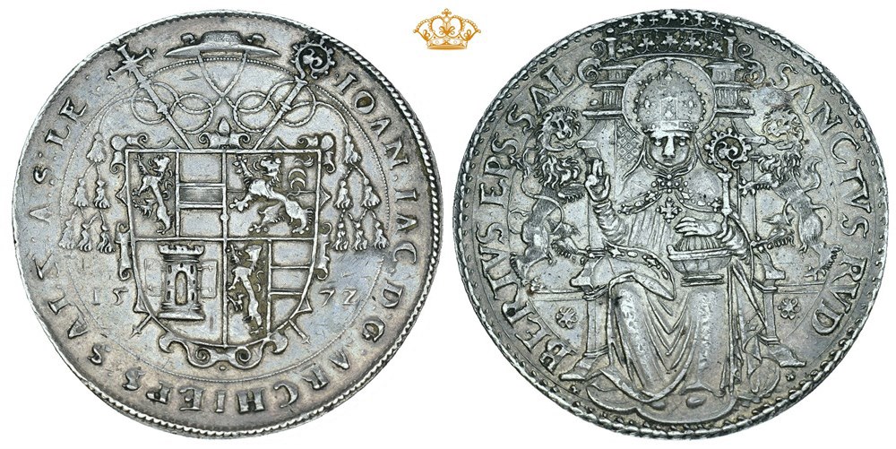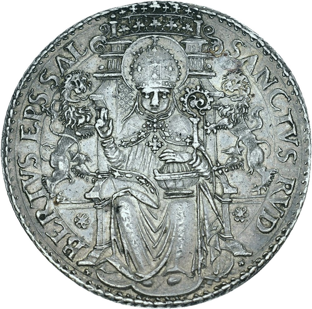 IOAN IAC D G ARCHIEPS SALZ A S LE 157Z, coat of arms, galero (cardinal's hat), cross and crosier / SANCTVS RVD BERTVS EPS SAL, St. Rudbertus with miter, blessing right hand and crosier enthroned facing front under a Gothic canopy, on each side an upright lion.