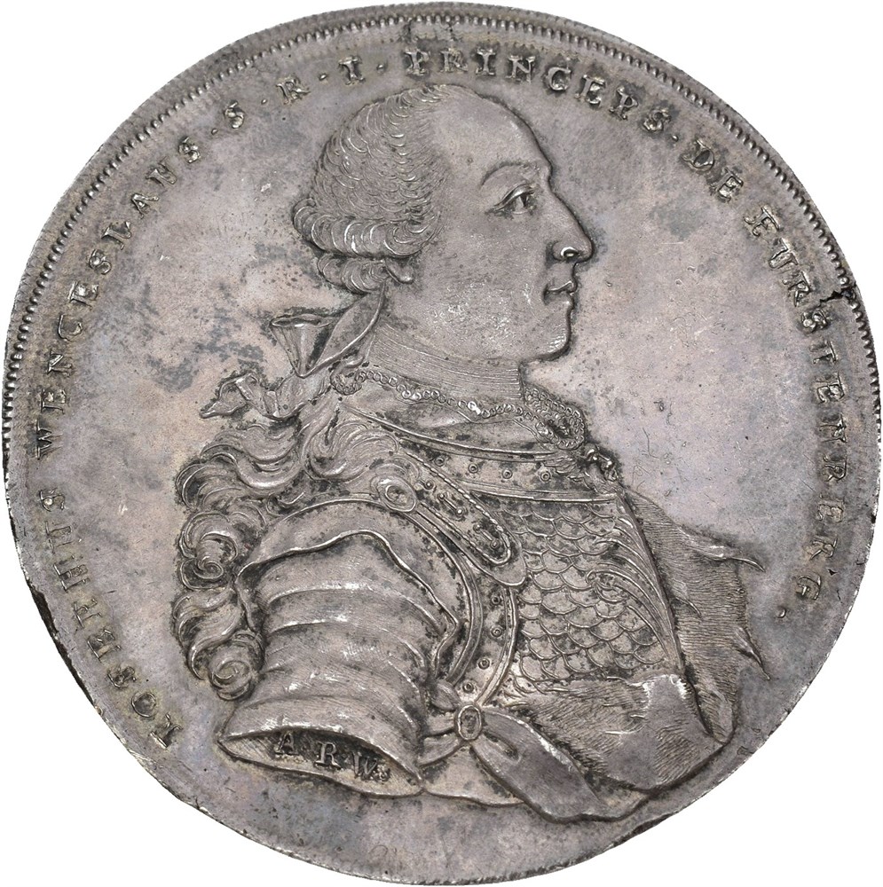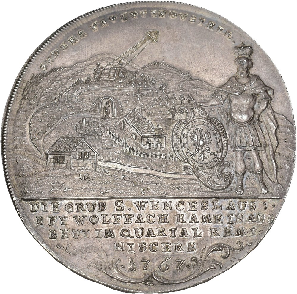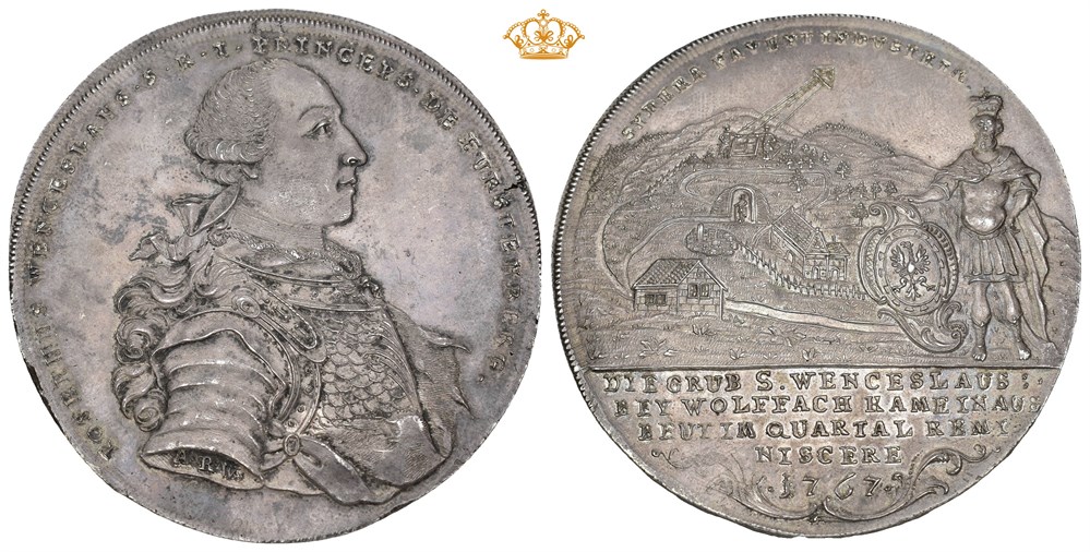 4 Taler 1767, Stuttgart. 111.86 g. Ausbeutethaler, silver form the St. Wenceslaus mine, Wolfach. IOSEPHUS WENCESLAUS S R I PRINCEPS DE FURSTENBERG A R W (engraver in Stuttgart Adam Rudolph Werner). Reverse: SADERA FAVENT INDUSTRIÆ DIE GRUB S. WENCESLAUS BEY WOLFFACH KAME INAUS BEUT IM QUARTAL REMINISCERE 1767, Mining landscape and standing St. Wenceslas with a coat of arms.