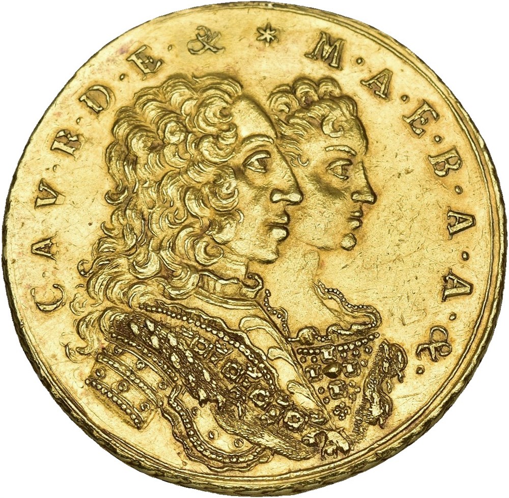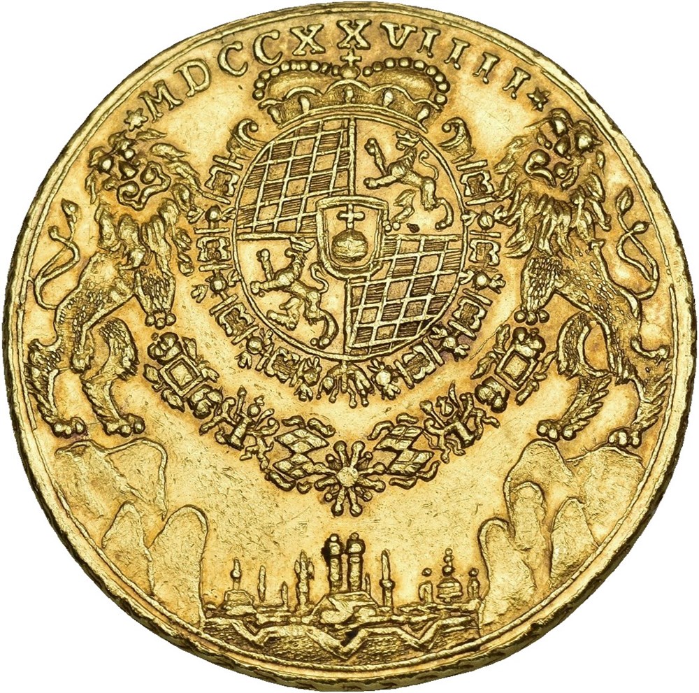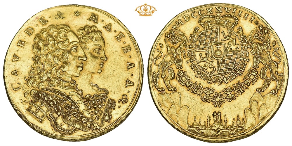2 Carolin 1729, Munich. 19.64 g. Busts of Charles Albert and his wife Maria Amalia, daughter of Joseph I of Austria. On reverse, lions standing on rocks holding coat of arms above the chain of the Order of St. George, below a view of Munich. Lustrous specimen of rare type celebrating the Foundation of the Order of St. George. Traces of handling.