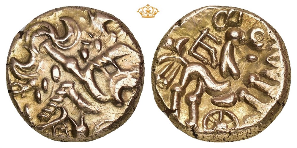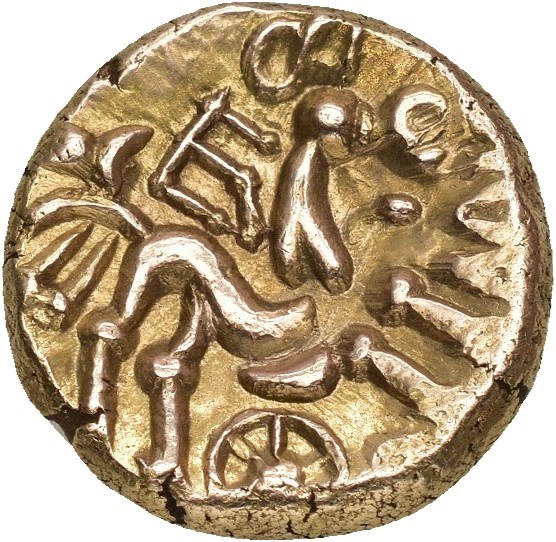 CELTIC, Atrebates & Regni. Commius, circa 50-25 BC. AV Stater (17 mm; 5.49 g). E Type. Southern mint, struck circa 30-25 BC. Obverse: Wreath design. Reverse: [COM]M[IOS], Horse right, E-like ornament above, wheel below. A few small marks in fields. Very rare.