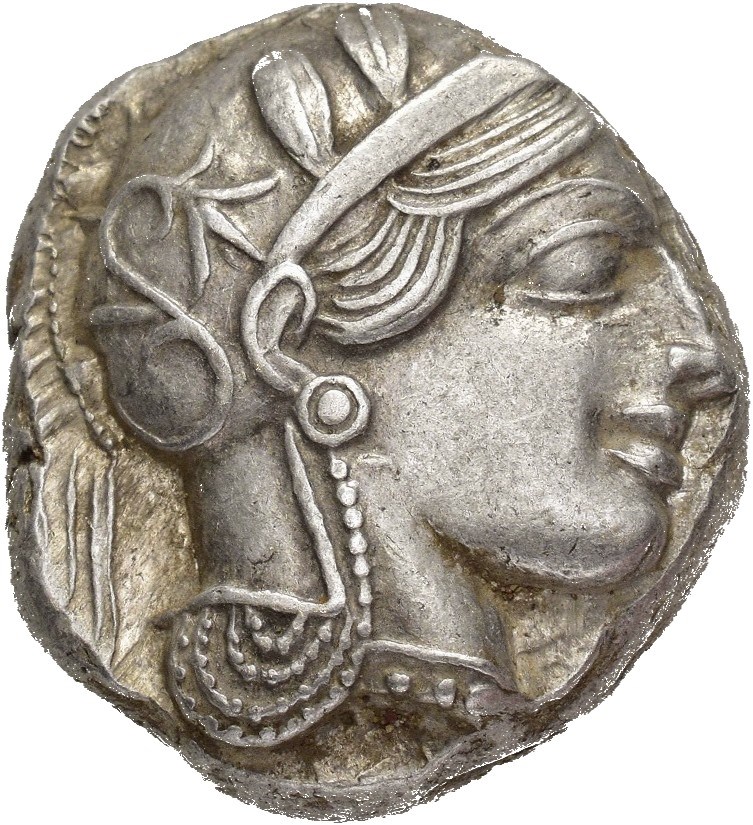 ATTICA, Athens. AR Tetradrachm (23 mm; 17.25 g). Struck circa 454-404 BC. Obverse: Head of Athena right with frontal eye, wearing crested and ornamented Attic helmet, earring and necklace. Reverse: ΑΘΕ, Owl standing right, head facing, closed tail feathers, olive sprig and crescent to left; all within incuse square. Light iridescent cabinet toning.
