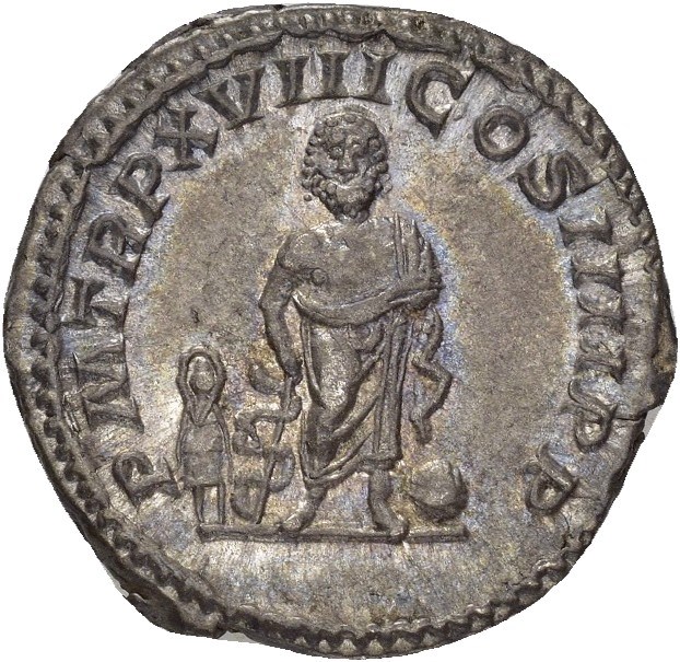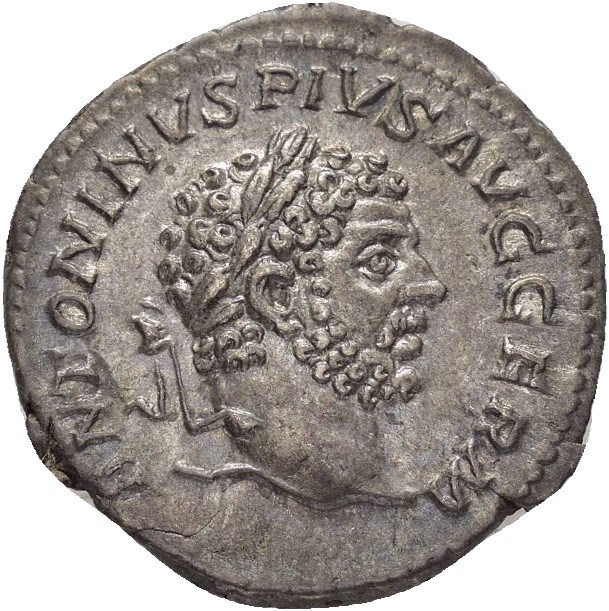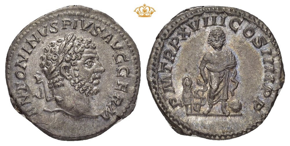 Caracalla 198-217 AD. AR Denarius (18 mm; 2.45 g). Rome mint, struck 215 AD. Obverse: ANTONINVS PIVS AVG GERM, Laureate head of Caracalla right. Reverse: P M TR P XVIII COS IIII P P, Asclepius standing facing, nude to the waist, holding a staff coiled with a serpent; Telesphorus to left; globe to right. Beautiful deep old cabinet toning.