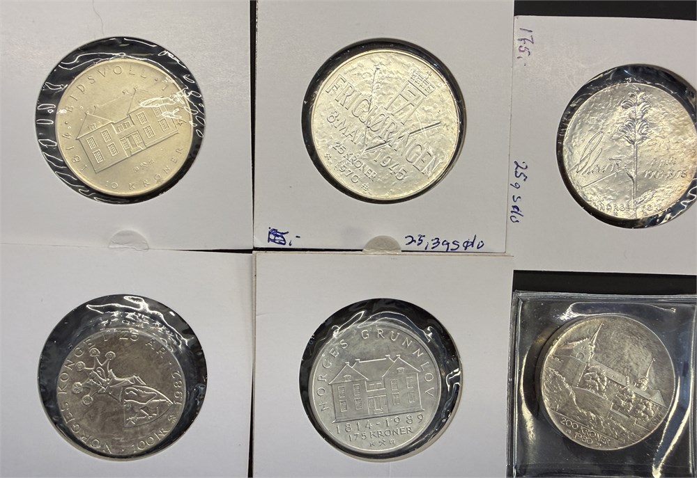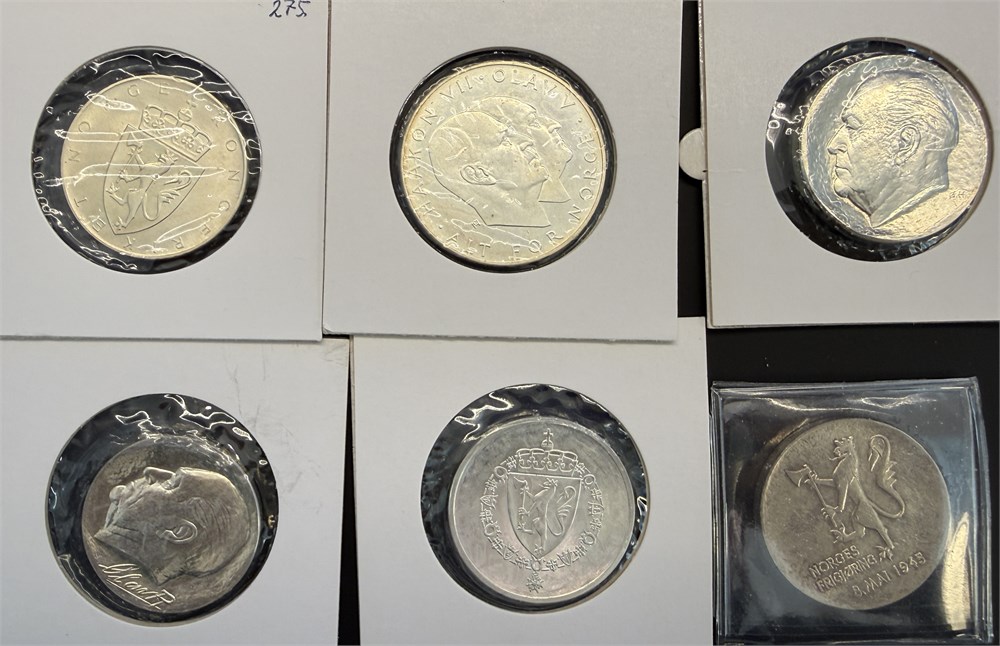 10 kroner 1964, 25 kroner 1970, 50 kroner 1978, 100 kroner 1982, 175 kroner 1989 og 200 kroner 1980, alle i Hartberger,