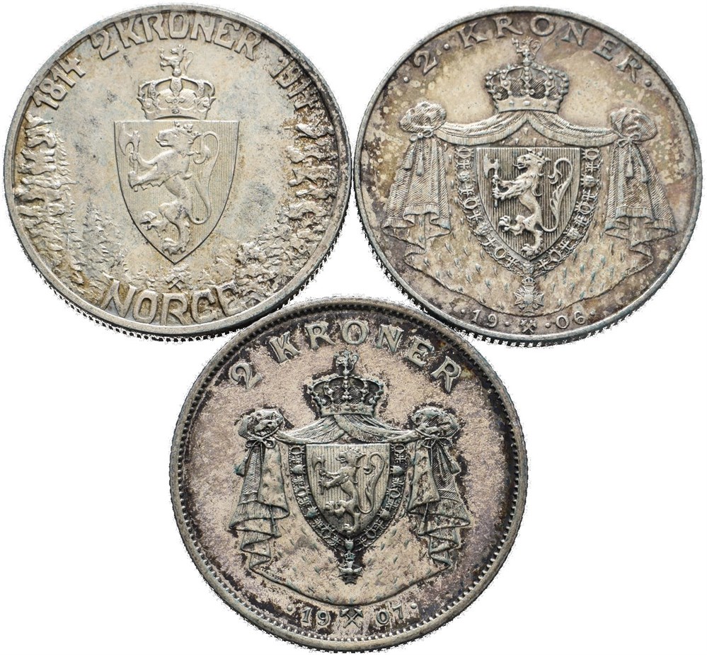 2 kroner jubileum 1906, 07 og 14, noe grønt irr, 1907 holder 0/01