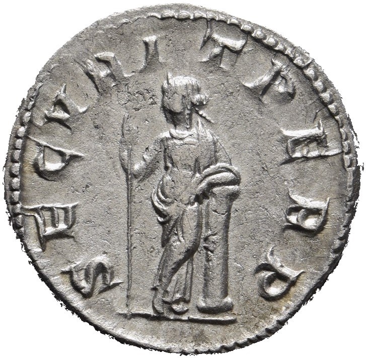 Gordianus III. AD 238-244. AR Antoninianus (22.5 mm; 5.25 g). Rome mint, struck 243-244. Radiate, draped, and cuirassed bust right / Securitas standing facing with legs crossed, head facing left, holding long scepter in right hand and resting left elbow on column. Lightly toned.