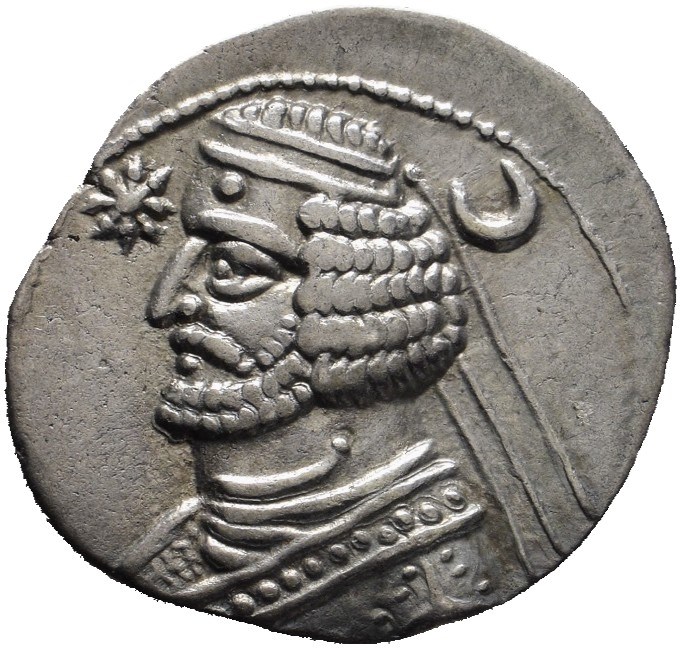 Orodes II. 57-37 BC. AR Drachm (21 mm; 4.01 g). Mithradatkart mint, struck circa 50-42 BC. Diademed bust left; star before, crescent behind / Archer (Arsakes I) seated right on throne, holding bow. Well struck and lightly toned.