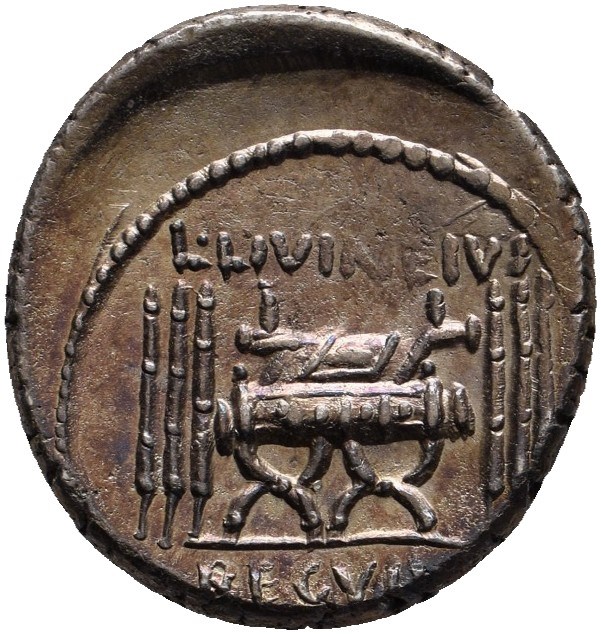 L. Livineius Regulus. 42 BC. AR Denarius (19 mm; 3.93 g). Rome mint. Bare head right / Curule chair between six fasces, three on either side. Some flatness of strike on obverse and struck slightly off-center. Harshly cleaned. Toned.